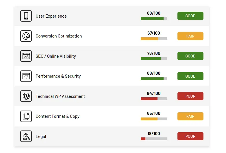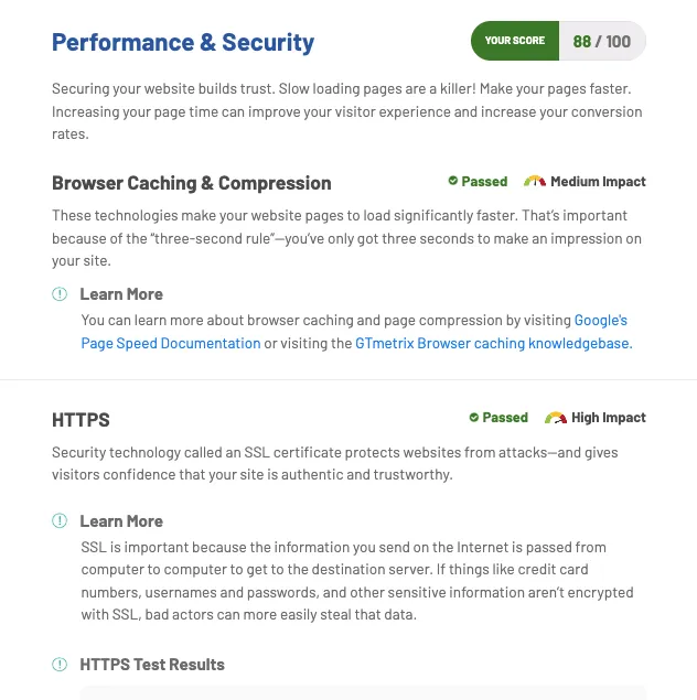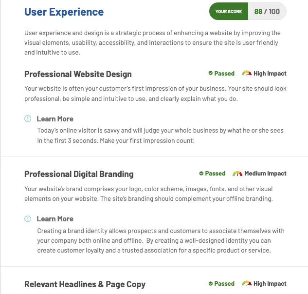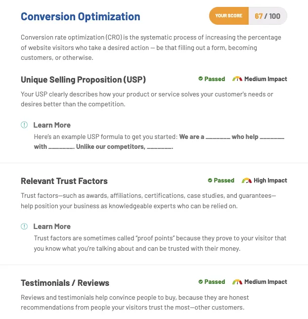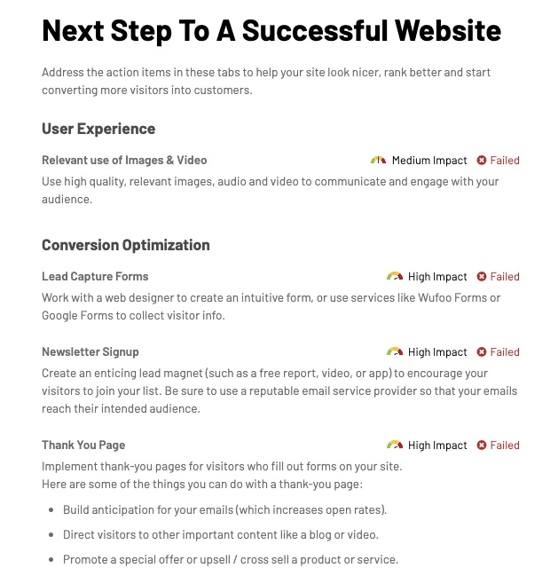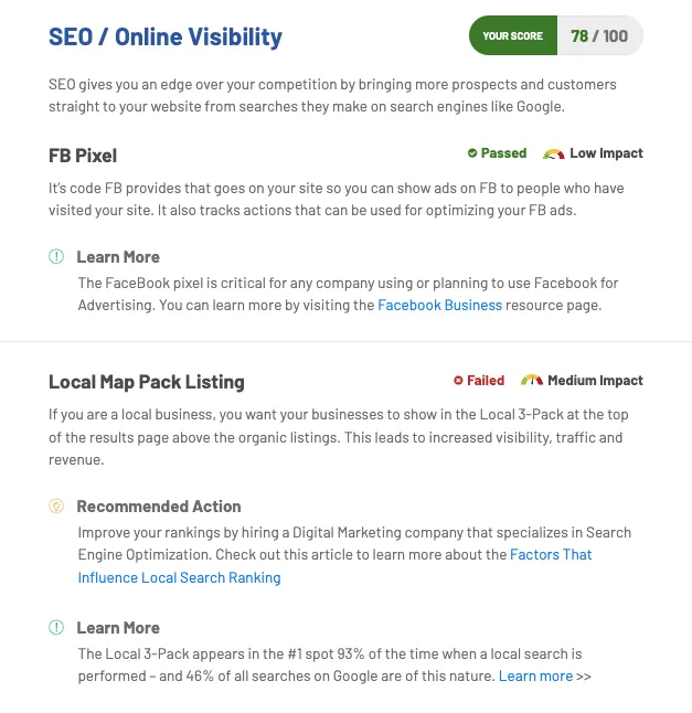 We'll analyze everything that's critical to your business being seen online, and we'll send you a detailed report with action items that you can implement right away. We'll look at your calls to action to see how well they're doing at converting visitors into customers. We'll look at how visible you are on Google. We'll even test the speed and security of your website.